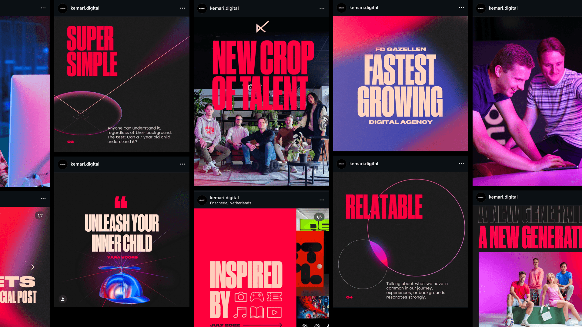 In 2021, as the Art Director for Kemari.digital, Enschede's leading digital agency, I took charge of their social media strategy and developed a cohesive design system inspired by neon light aesthetics. Collaborating closely with the team at Kemari, we produced a series of weekly social content and digital journals, each with its own unique visual identity while remaining true to the overarching design system. This initiative successfully cultivated a vibrant community, increasing follower engagement and sparking meaningful conversations around the featured topics.